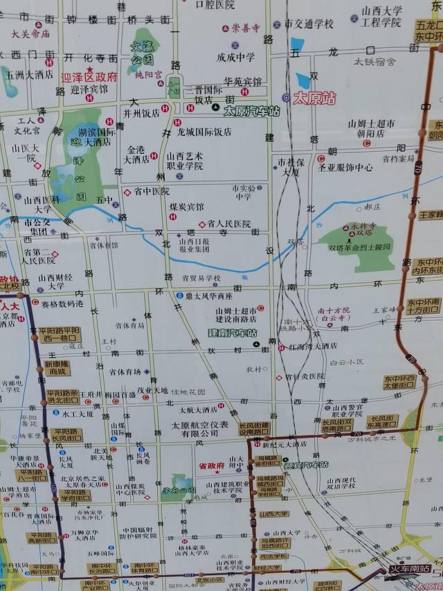 这是我在太原行程主要去的地方,从东南角太原南站乘棕色公交线的公交车到长风街建设南路口下车,左边的太原航空仪表有限公司就是原来我生活过的三营盘。往西北方向有条并州南路,再经并州北路到五一广场。广场左面是文瀛公园,当初叫人民公园,我住初中的宿舍就在公园旁边。再往西北角插进去,一条横街通往钟楼街,直抵关帝庙,那曾经是我初一时候的学生食堂。五一广场西南面有个迎泽公园,我网上预订了公园南门外不远处的宾馆。在上图的右边有个永祚寺里的双塔,也是我小时候爬过的。