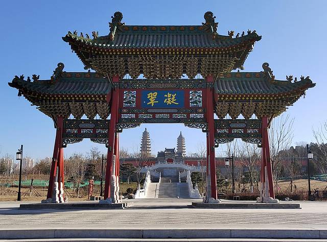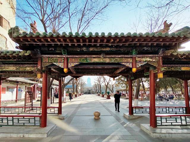 透过门口牌坊望见远处山岗上的永祚寺和双塔