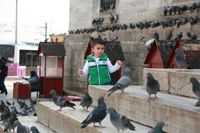 清真寺外和鸽子玩耍的小朋友。