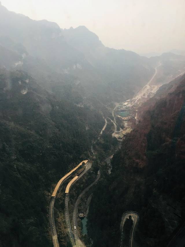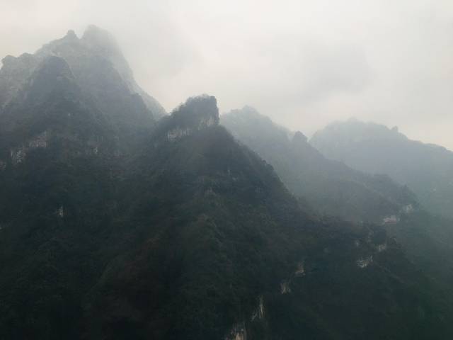 5.1.1 天门山索道:游览天门山,上山的途径之一是乘坐长达7500米的索道,游客可以在缆车中俯瞰山中及周边美景。在天门山索道站排队等候,从广场开始持续到缆车乘降站三楼,估摸一下今早能有上万人,我们被选择A线,索道上下(其实,我们事后感觉旅行社一定知道大雾天气是看不到天门洞的),费用已经包含在团费里,另外交的90元包括了扶梯、鞋套费用,走玻璃栈道,扶梯到天门洞上下。不到八点拿到票,排队估计9:30能乘上索道车。天门山景区缆车乘降点只能用更糟糕来形容,秩序混乱,等候时间长,焦急的等待把游客对景区美好的期待都消耗殆尽。
