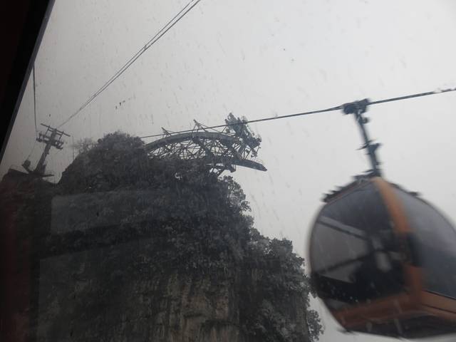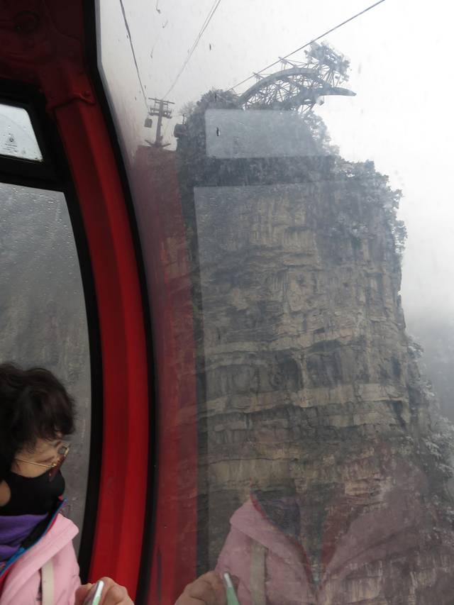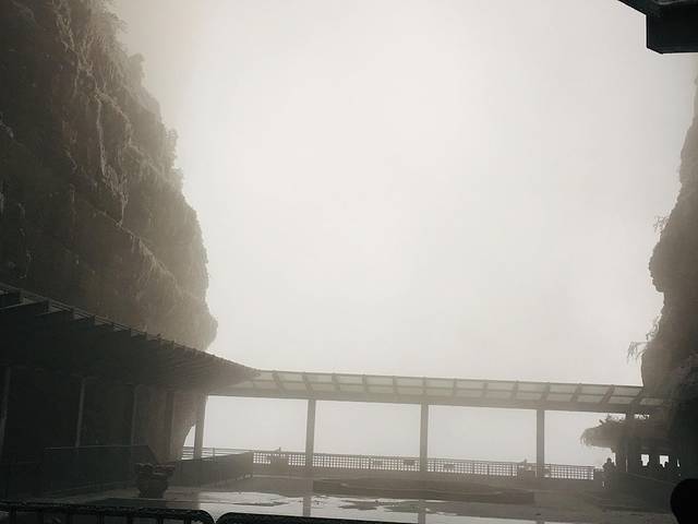 扶梯下行刚好在天门洞附近,但今天大雾天门洞景区封闭。看见眼前,若隐若现地矗立在云雾中的天门洞,导游说天门洞高180多米,宽50多米,进深60多米,可惜在这样的大雾天不能一睹真容。