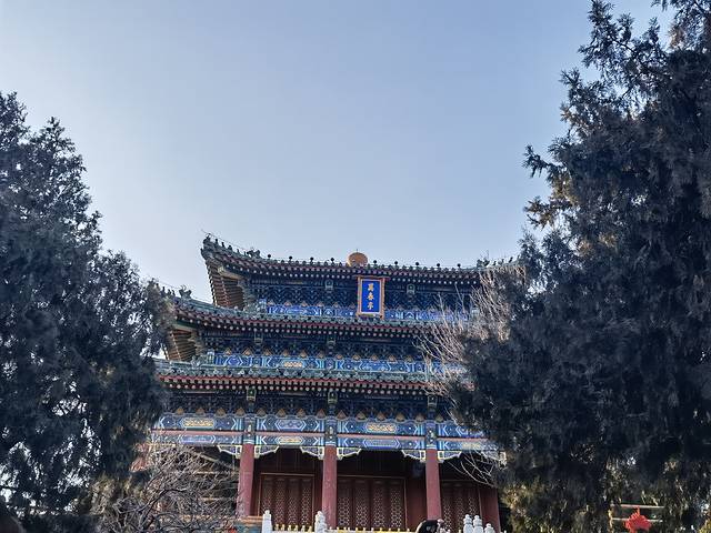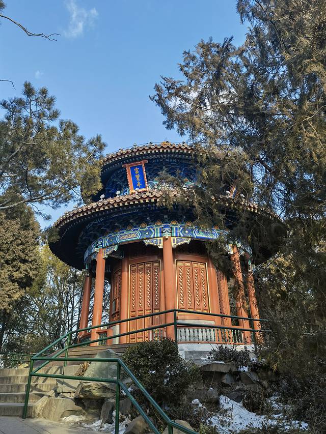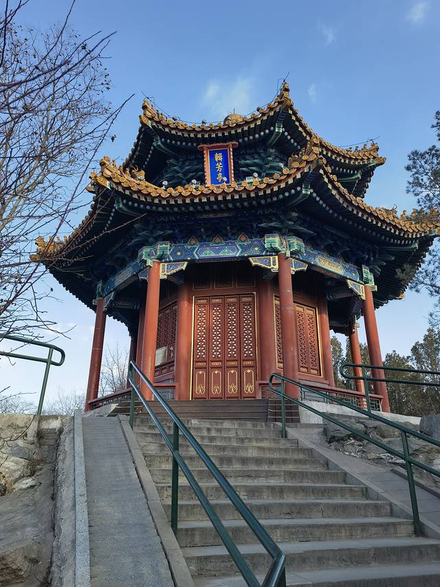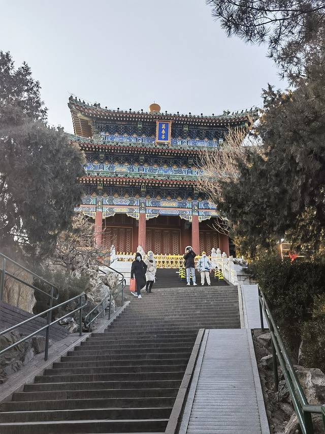 鼓气而上最后登顶看到巍峨雄伟的万春亭。该亭立于景山最高处,建于乾隆十五年(1750年),是北京南北建筑中轴线的基点。还是北京中轴线上的制高点,京华览胜第一处。亭高15.38米,平面呈四方形,为三重檐四角攒尖顶,上檐和中檐均为九踩三昂斗拱,下檐为七踩重昂斗拱,黄琉璃瓦覆顶绿剪边,檐上有琉璃宝顶,建筑面积296.5平方米。万春亭的彩绘称为:旋子大点金龙锦枋心,这也是中国皇家等级最高的彩绘形式。
