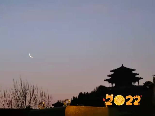 2022年元旦想登景山,迎接新年的第一缕阳光。谁知道“同此心者”颇众,排队限流了,俩小时也上不了山。不得已乘兴而来,扫兴而归。只有一弯新月,几缕朝晖,留作纪念。