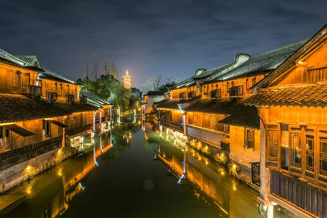 白莲寺塔是西栅与京杭大运河的分界线,同时也是乌镇西栅最高的古建筑。在夜晚灯火的掩映下更像一幅画。好像是突破了时间的束缚,来到苏湖熟天下足那个时代的江南。