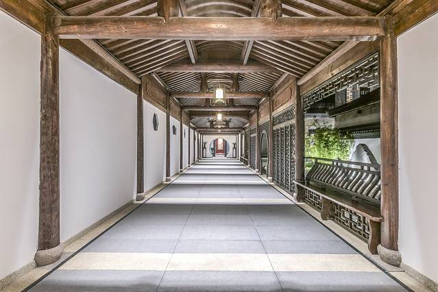 酒店的公共区域还是很大的,不仅有以前的老房屋还有新建的房舍以及花园。从大厅或者客房通过这条走廊即可抵达西栅景区外了,真正意义上睡在景区里面的酒店。