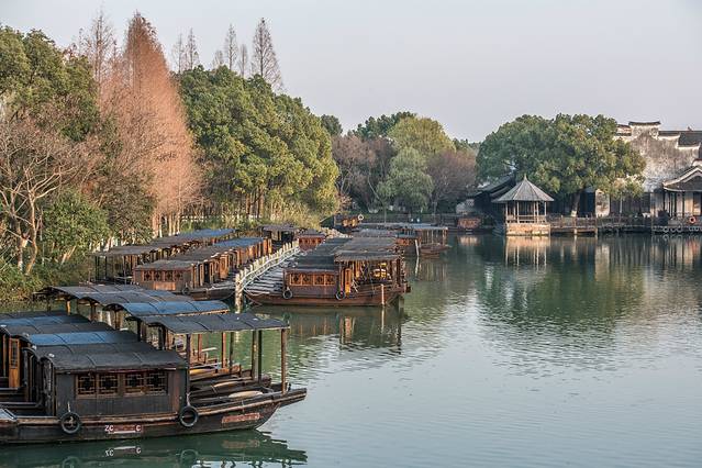 在乌镇西栅,自然与人文相融合的美景令人沉醉!停靠在码头边的橹船让人不禁想起“门泊东吴万里船”的意境。位于西栅最东边的这座码头,在船只的停靠下赋予了水的柔美性与灵动性,好一幅绝美的诗韵江南画卷!