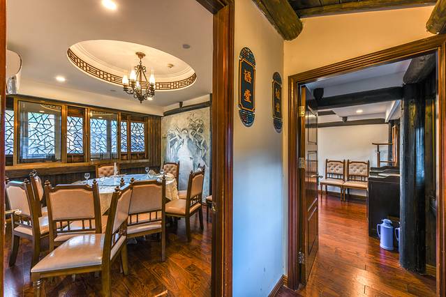 山野君简单地介绍一下餐厅环境与设施,现在是该吃饭的时间了,我们上二楼就餐。装修设计在保留中式古屋的同时还融入了民国时代的轻奢风,这样的餐厅环境还是很好的,况且还有绝佳的观景视野。