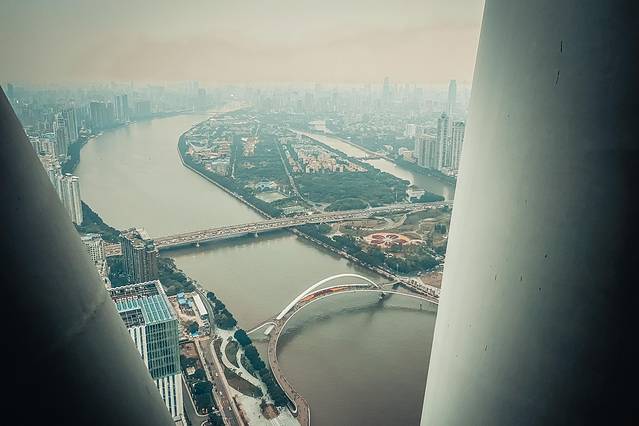 栏杆外面风景独好,虽然降温前的 广州 天气阴霾,但是从上帝视角俯瞰整个城市,看珠江像纽带一样地穿城而过,还是觉得很养眼的!希望一会儿走上红蓝绿线之后,还一样有这么好的心情看风景!