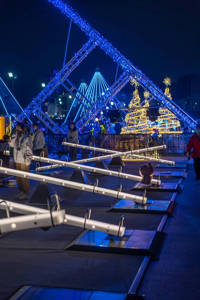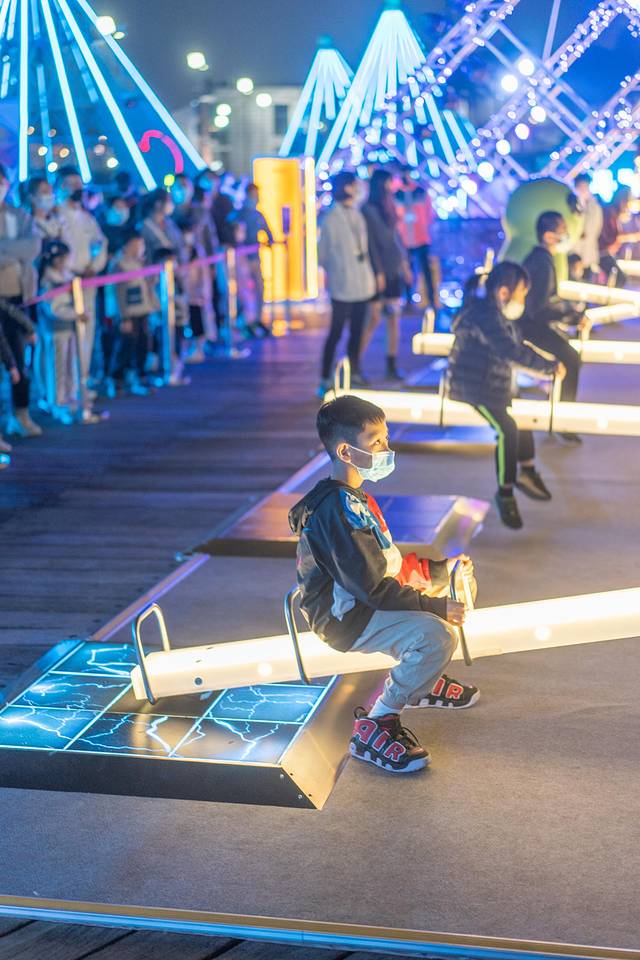 你看这个会发光的跷跷板,是不是梦幻极了?我来到的时候是刚刚举行完无人机表演,现场的人潮还没有散去,大家很多都用来打卡雅文湖畔的灯光装置。