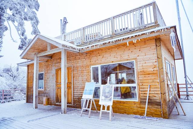 这次我们就住的这里,海拔2900米,位于王岗坪最高处的森林里,冬天这里的雪和雾凇都最漂亮,特别是旁边的怪树林,就算天气不好,这里也能出片。整个木屋就是北欧风,就像住在冰雪里的童话世界一样。