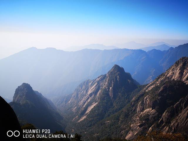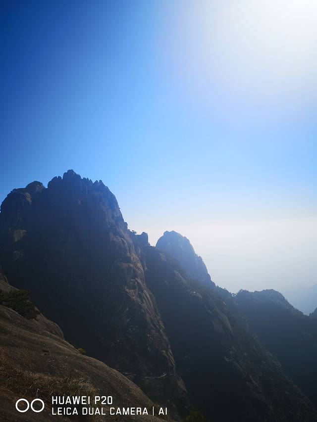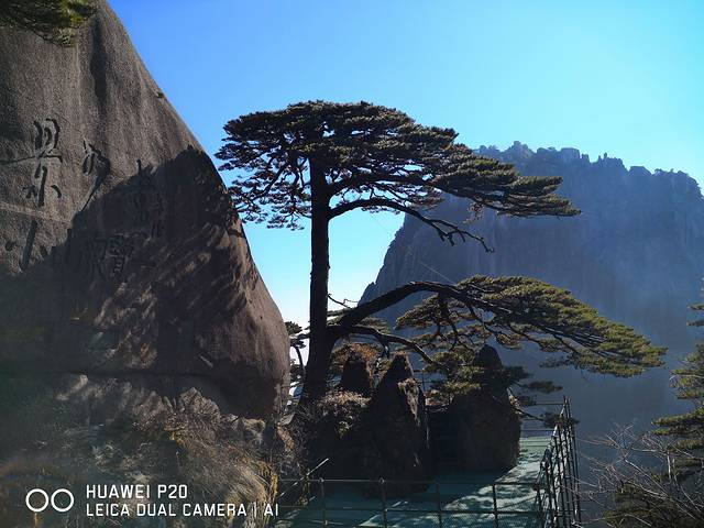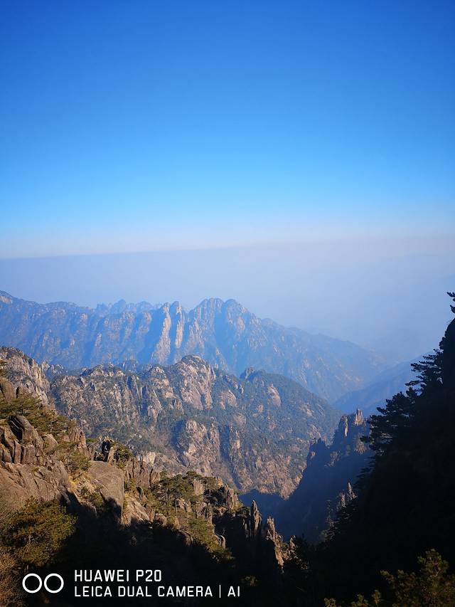 从迎客松旁远眺,层峦叠嶂的山峰,据说雨水多季节,如果阳光大好,看到的犹如仙境一般,只可惜我们去得时候阳光大好,加上冬季少雨,只能看到大片的霾😓😓😓