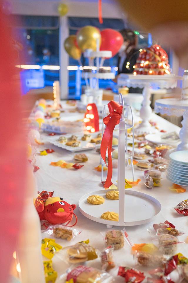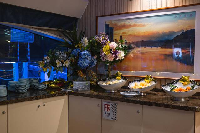 走进船舱,慢慢的新年氛围感,服务员也早早就备好了点心,水果和小零食,乐队也已经在深情的演唱,游客们陆陆续续的登船,不一会就热闹了起来,欢声笑语,虽然都不认识,但大家还都是会很热情的相互道一句新年快乐,这感觉真的好极了,不是吗?