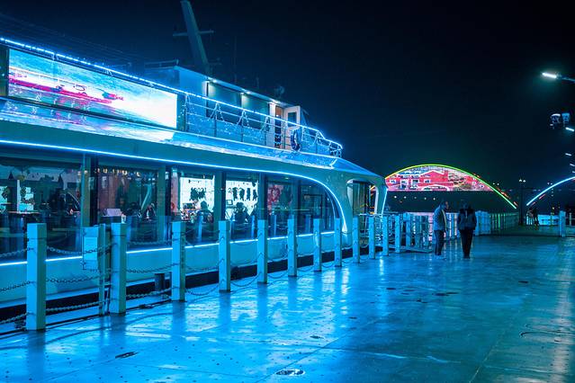 新安江作为一条山江河流,就像一条闪闪发亮的银练,穿行于锦峰秀岭、山乡古建筑之间。晚上七点半准时来到了新安江畔的风月轩游船码头开始登船,这次晚上乘坐的是“梦幻17号”游船,航线全程约2下个小时,如果是平常的话,这艘船可以乘坐能达到230人,但这次仅限量100张船票。