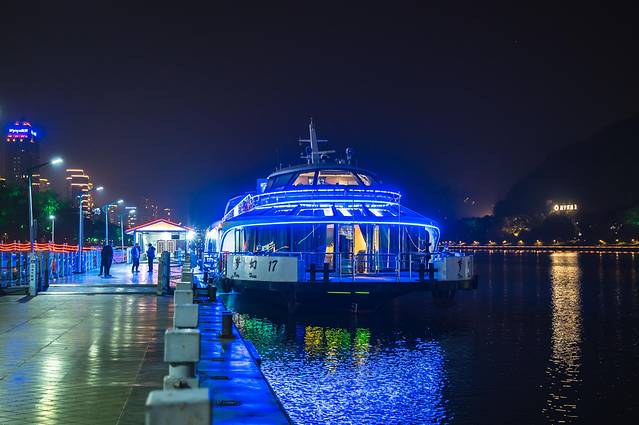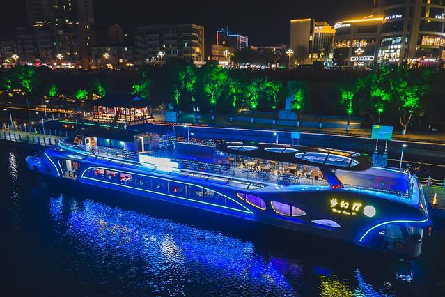 “梦幻17号”游船是一艘历时一年打造而成的大型豪华餐饮游船,是建德首艘以“餐饮观光”为主题的游船,可载客达230人,航线全程约2下个小时。梦幻17号游船的造型恍若一只超大的白鳍豚,夜色下,幽蓝色的灯光笼罩着船身,这种色彩非常解压,同时也给人一种大海的深邃感,宁静、神秘、梦幻。