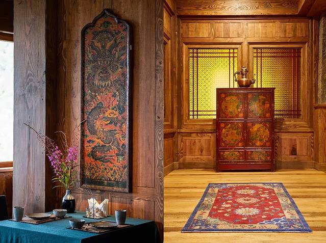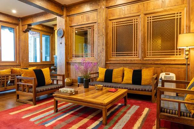 走进室内,扑面而来是藏族风情。室内以实木为主,相当温馨,深褐色的木器漆,点缀着精美的壁炉、藏毯、各种工艺品。大厅的壁炉随时放着热姜茶,让住客暖身。