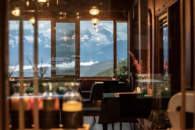 顶层雪山酒吧是广受大家追捧的。三面都是大片落地玻璃窗,可以360° 全景观赏雪山。西面是一字排开开的梅里十三峰,东面是白马雪山。整个空间保温相当好,容许你早晨7点半再笃悠悠起床,爬上四楼,在暖和的空间里看日照金山,这一点就已经很优秀了。