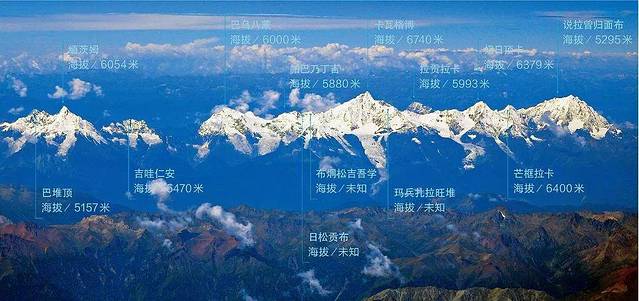这座群山中比较有名的是:卡瓦格博峰(又称“雪山之神”,喜马拉雅王太子)、缅茨姆峰(神女峰,卡瓦格博峰之妻)、吉娃仁安(加瓦仁安,藏语意为“五佛之冠”,太子妃缅茨姆的贴身扈从)等。