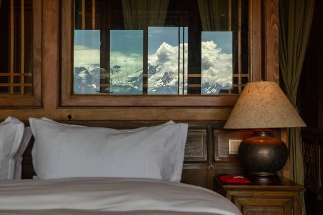 毫不夸张地说,松赞梅里山居的窗就是为雪山开的。漫步于酒店,在餐厅、书吧、大堂等公共区域及大部分房间都能直接看到梅里雪山。