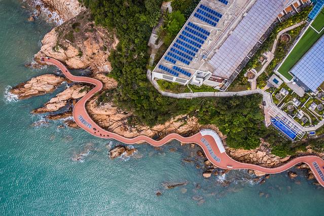 走过钻石沙滩,沿着格力东澳大酒店一侧,蜿蜒曲折的山海云道像一支画笔,勾勒出东澳岛山海画卷最美的模样。这是东澳岛全新开放的离岛滨海栈道,全长671米,悬空玻璃栈道式的亲水平台穿插其中,低头即可领略碧波荡漾、清涛抚岸,散落在平台上的蓝色鲸鱼雕塑,更是增添了不少萌趣,漫行于步道之上,一览东澳岛独特的“山海胜境”。