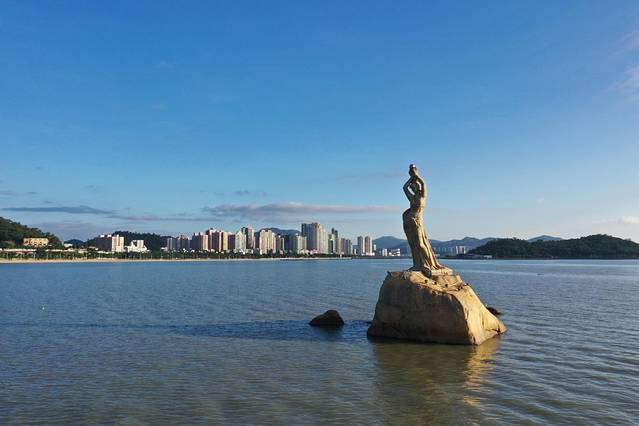 渔女雕像伫立在珠海香炉湾畔,是中国著名雕塑家潘鹤的杰作。她手戴玉镯,颈配珍珠,身披渔网,双手托举着明珠,带着喜悦而又含羞的神情,欢迎八方游客的到来。在珠海,渔女是不可替代的城市象征,几十年来,她依旧静静的守护着这一方土地。