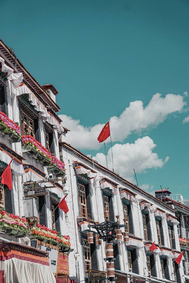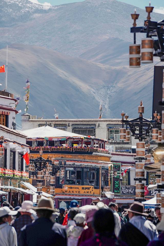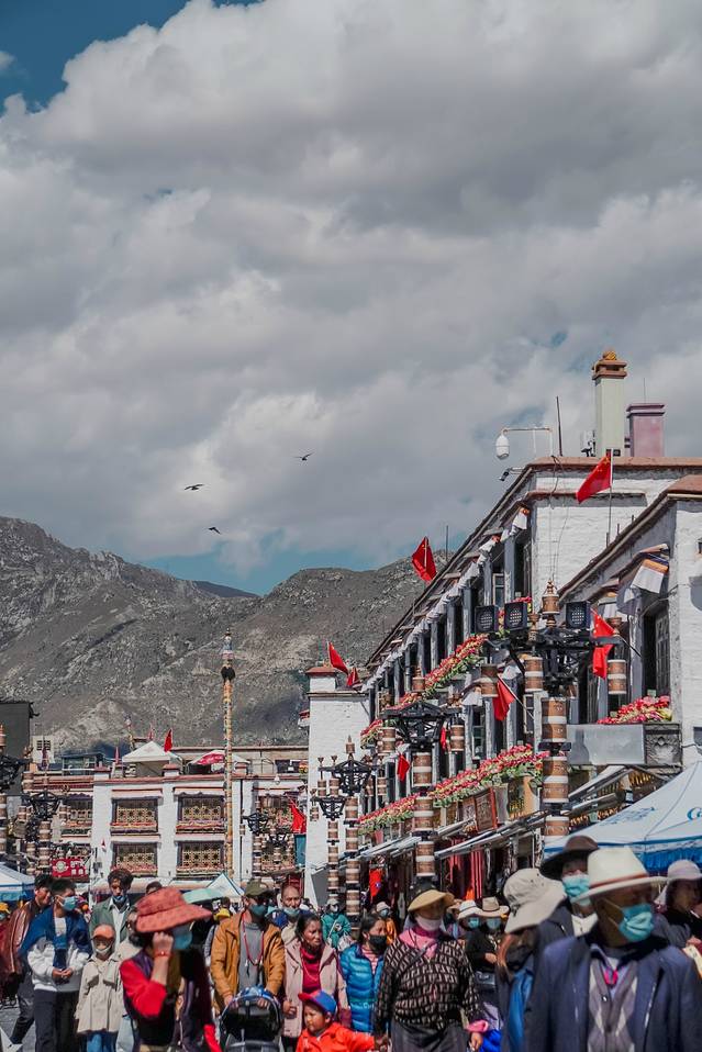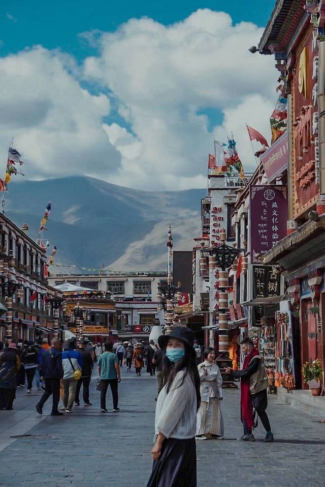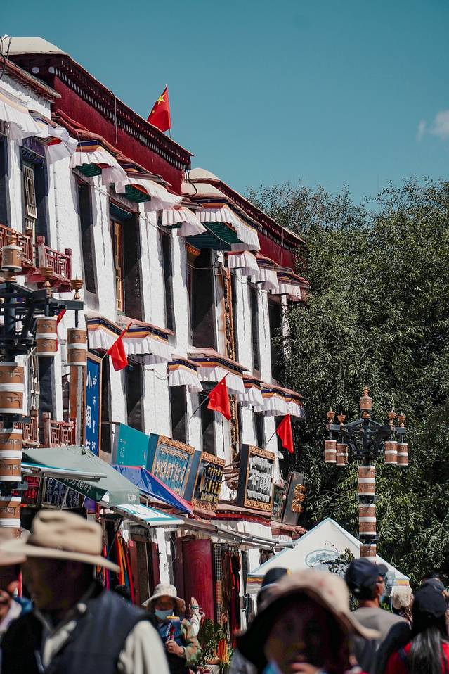 八廓街是感受拉萨日光的最佳场所,晴空万里,湛蓝的天空,云朵仿佛触手可及。一栋栋藏式小楼,各种治愈系的色彩在眼前展开,是这里一道独特的风景线。