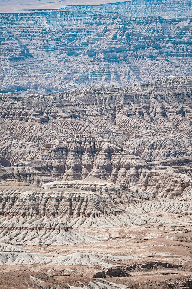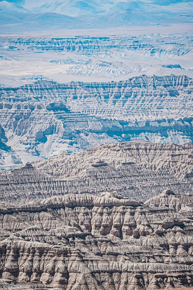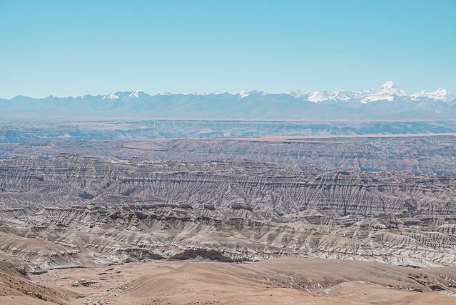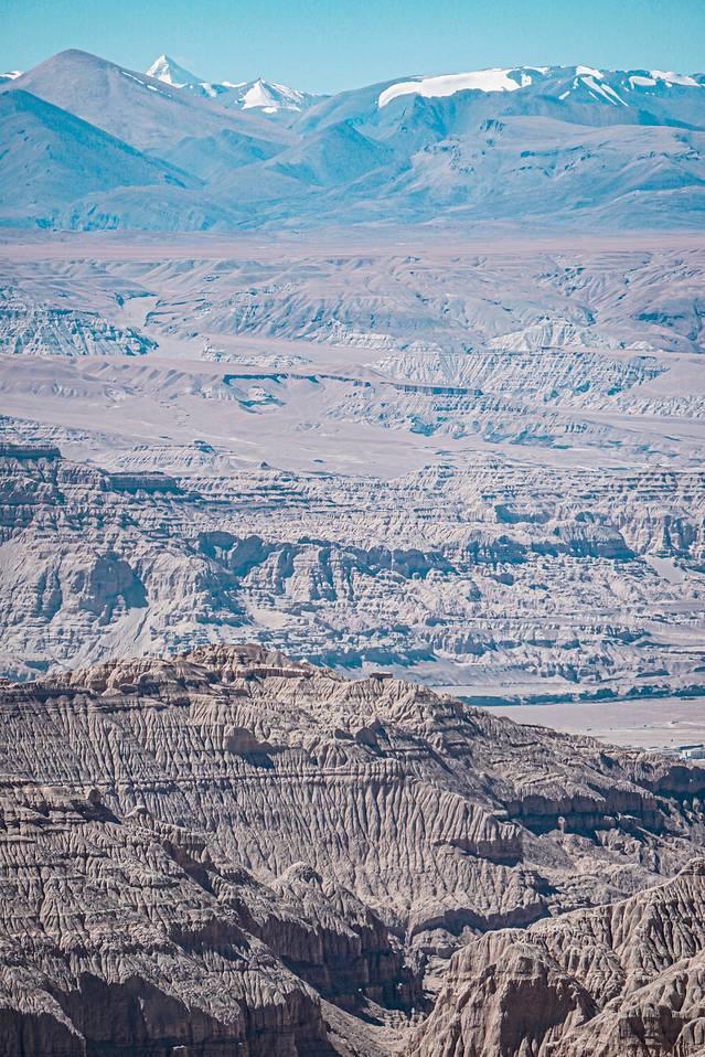 看到眼前的景观,我们迫不及待在路边找了一个观景台,站在高处俯瞰这片壮观的土林,望着伸向远方层层叠叠的沟壑,与雪山连在一起,不由感慨大自然的精心雕琢。