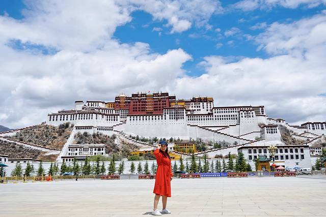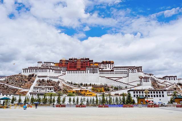 布达拉宫是以白色和红色为主的建筑风格,颜色分明。站在布达拉宫广场,就能感受到这栋建筑屹立在蓝天白云之下的壮观。