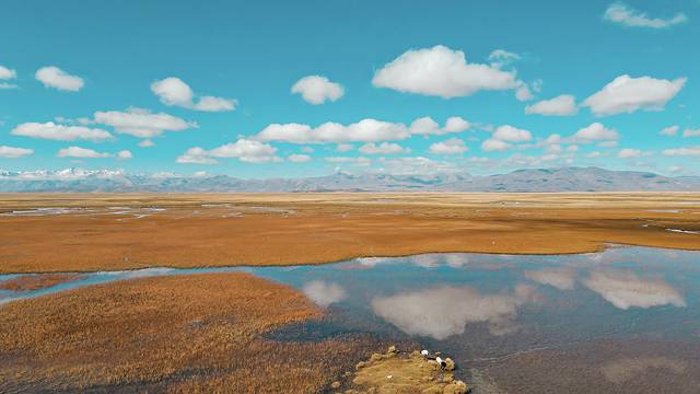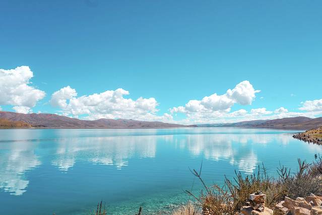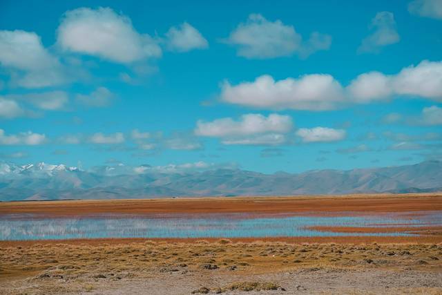出发前往玛旁雍措的路上,天气出奇地好,遇见一片小湖泊,与蓝天、白云、雪山、荒漠融合在一起,在大自然的神奇光线里,千姿百态的云朵仿佛触手可及,就像梦境一样。