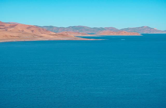 羊湖的湖水会受天气的影响,不同阳光的照射,湖水会随着太阳光线的转移呈现不同的蓝,时而深时而浅,演变成千变万化的蓝色。