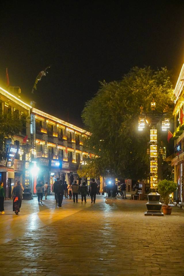 夜幕降临,华灯初照,漫步于街头,橘黄路灯温暖迷人,映衬着深蓝天空,多了一份更温暖的感觉,相较于白天的八廓街,晚上更显得神秘而别具特色。