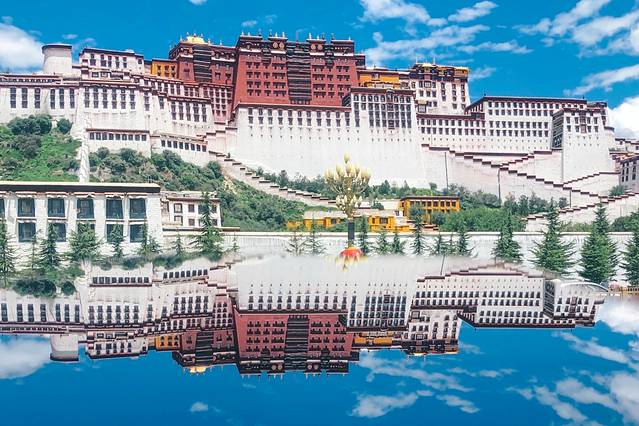 布达拉宫是世界上海拔最高,集宫殿、城堡和寺院于一体的宏伟建筑,也是西藏最庞大、最完整的古代宫殿建筑群。布达拉宫依山垒砌,群楼重叠,气势雄伟,是藏式古建筑的杰出代表,也是第五套人民币50元纸币背面的风景图案。主体建筑分为白宫和红宫两部分,宫殿高200余米,外观13层,内为9层。
