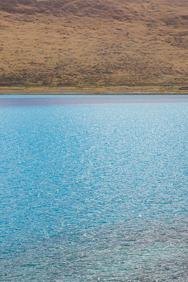 秋日时分来到,隐匿在山谷里的羊卓雍措,一片蔚蓝模样,午后阳光洒在湖面上,闪闪星光。