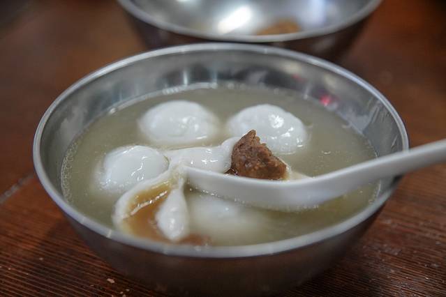 咸口的包心馅料与鱼丸相似,只不过把鱼丸的表皮换成了软糯的元宵,要不是吃太撑,这份咸口元宵应该会很好吃吧,可惜此刻我只能随意扒拉两口敷衍了事了。
