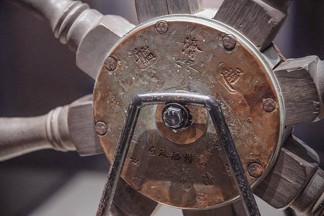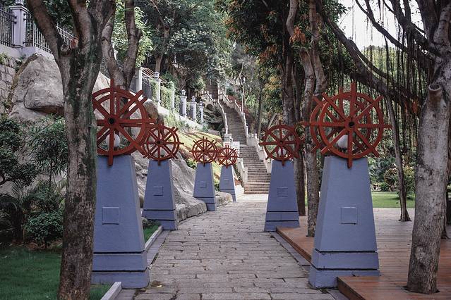 入园之后有一小段时空长廊,摆放的顺序是木板向舵盘过渡,寓意从船政舰船从木制到钢甲再到现代化的演化过程,拾阶而上直到最高处便到了罗星塔下。