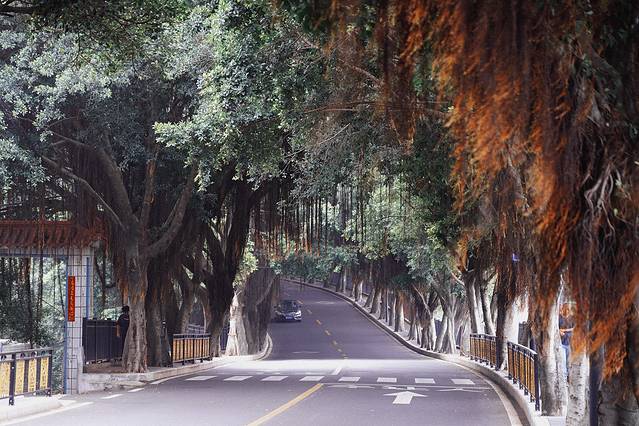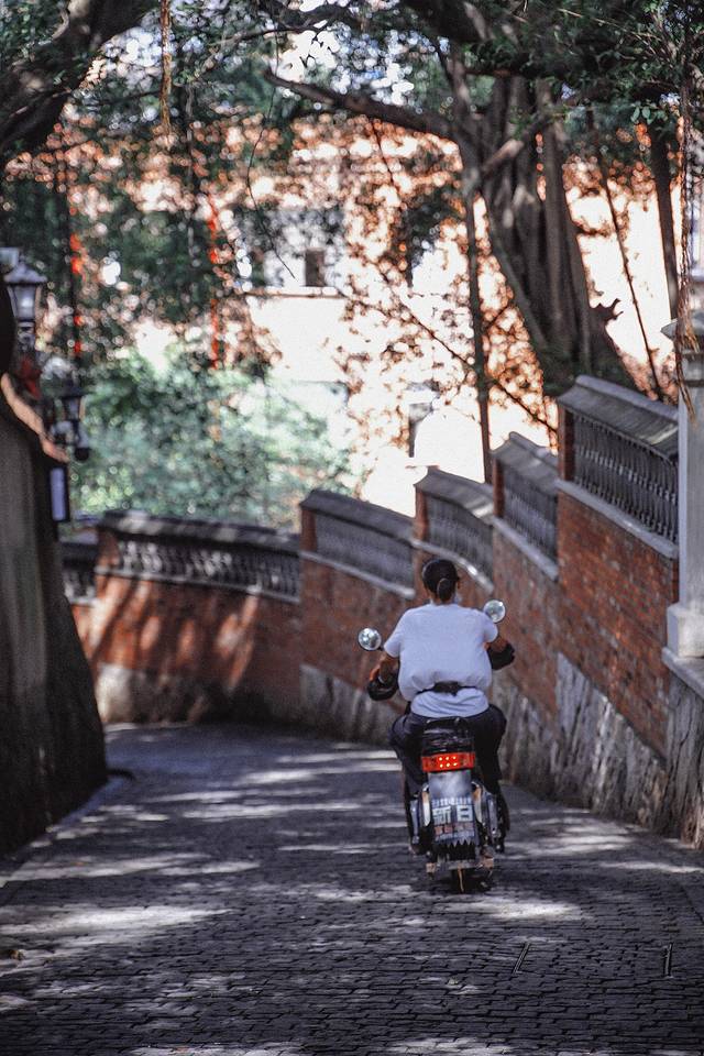 白天除了居民和零星几个摄影爱好者,很少能看到行人,从石厝教堂往前便是一段很长的下坡路,两边是石基红墙,不时有古树串出墙头,走在这里我不说,真的还以为是鼓浪屿。