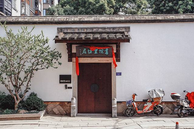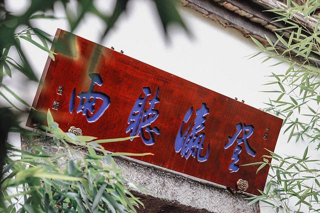 白墙灰瓦的大门融入到这一片书香门第气中,踏过青石板进入书院里坊居的正堂,这是一座精心设计翻新的老宅子,新中式装修透露着复古格调。竹林青影与这片古香古色相得益彰,显得静谧而有富有生气,像一副水墨画。而客房则在一片回廊尽头,宛如穿越到古代。他们家屋顶可以上去,晚上爬上屋顶举杯邀明月也是不错的。