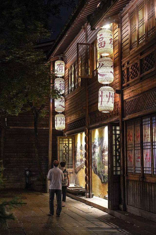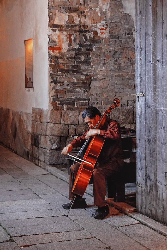 三坊七巷的夜晚可不比白天啊,这两侧小街白墙灯笼,一条幽幽长巷,走得心慌慌,转角传来大提琴声,竟然有位大叔在练琴。