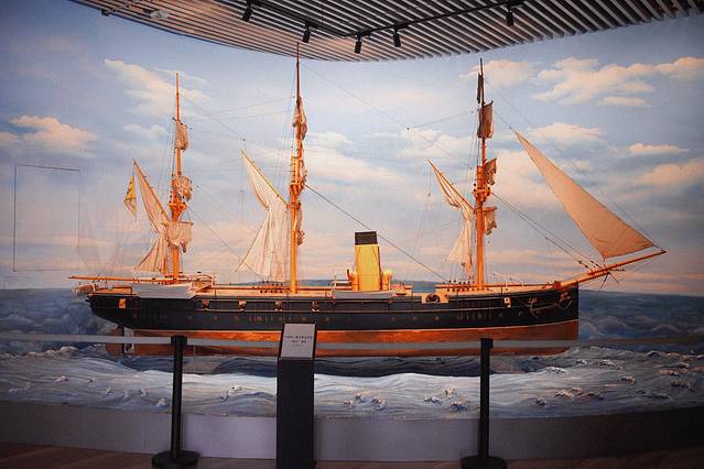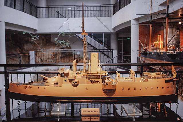 走进博物馆映入眼帘的就是一艘1:13比例的“扬武”号巡洋舰模型,“扬武”号是福建船政水师的旗舰,是船政造船厂仿造西洋兵舰自主建造的第一艘兵舰,于1871年开建,1872年下水,排水量1560吨,这在当时成为远东最大的巡洋舰。在1874年爆发的台湾事件中,有力地威慑日本人,使之不敢纵兵入侵台湾,之后“扬武”号每年巡弋中国南海,铁路之父詹天佑、思想家严复、以及爱国将领邓世昌等一干北洋将领都曾先后在“扬武”号上服役。而马江海战开战后,“扬武”号在毫无防备的情况下也最先遭受攻击,不久沉没。