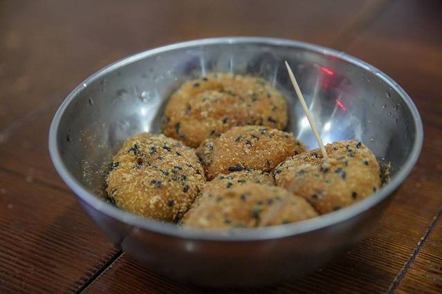 一份甜口、一份咸口,两份元宵上桌我就后悔了,这哪是小点,妥妥的主食啊。甜口的类似汤圆,个头大了不少,包着花生碎等又有点类似闽南的麻糍,总体来说还是很好吃的。