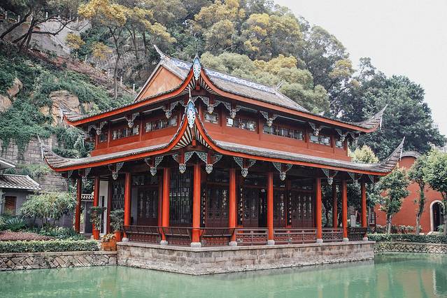 穿过左侧的廊桥,便是追思亭,这里正在播放马江海战的纪录片,亭子呈水榭结构,三面环水,阴凉得很,在这里小憩片刻。