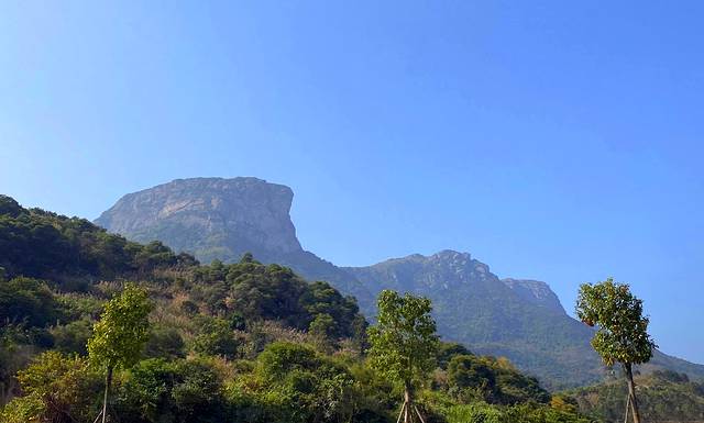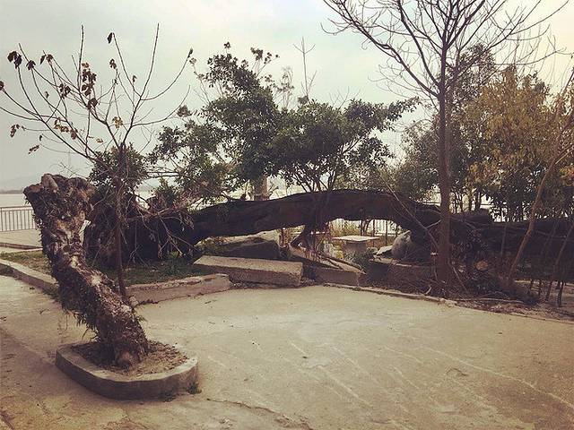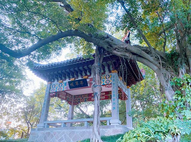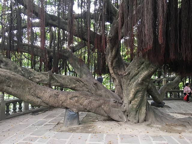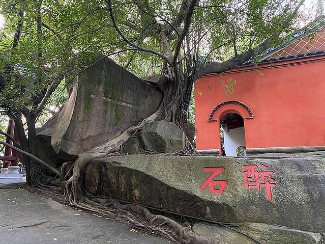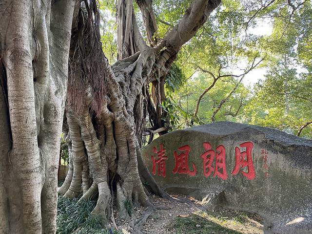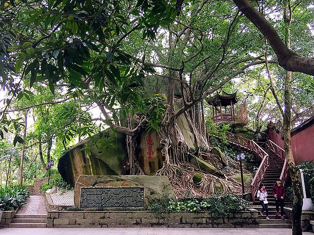 狮子岩的美主要还在于岩顶上附生的一株大榕树,根须造型独特,盘错虬结,纠缠在岩顶之上,远远望去象雄狮飘逸的鬃毛,故得名“狮鬃榕”