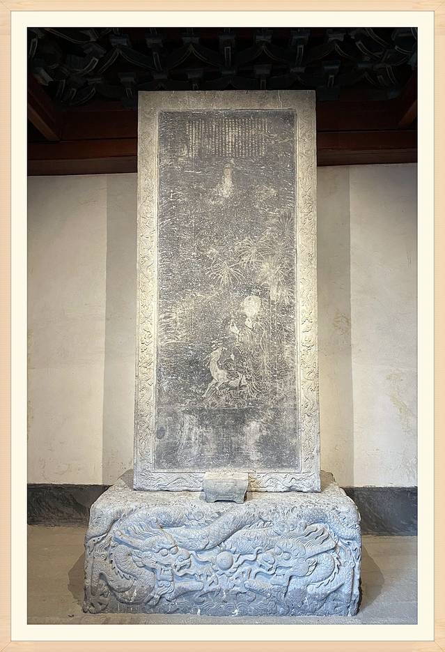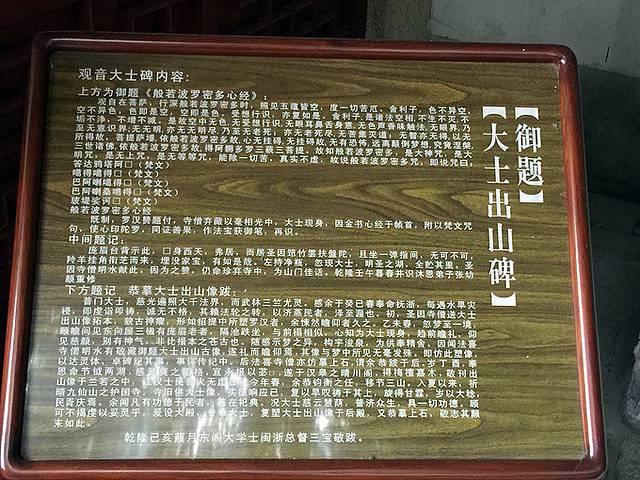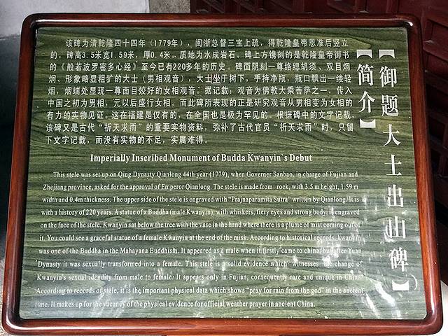 此碑官方简介:该碑为清乾隆44年(1779年),闽浙总督三宝上疏,得乾隆皇帝恩准后竖立的。碑高3.5米,宽1.59米,厚0.4米。质地为水成岩石。碑上方镌刻的是乾隆皇帝御书的《般若波罗蜜多心经》,至今已有220多年的历史。碑面阴刻一尊络腮胡须、形象略嫌粗犷的大士(男相观音),大士坐于树下,手持净瓶,烟口飘出一缕轻烟,烟端处显现一尊面目姣好的女相观音。据记载:观音为佛教大乘菩萨之一,传入中国之初为男相,元以后盛行女相。而此碑表现的正是研究观音从男相变为女相的有力的实物见证。这在福建是仅有的,在全国也是极为罕见的。根据碑中的文字记载,该碑又是古代“祈天求雨”的重要实物资料,弥补了古代官员“祈天求雨”时,只留下文字记载,而没有实物的不足,实属难得。