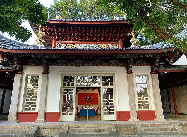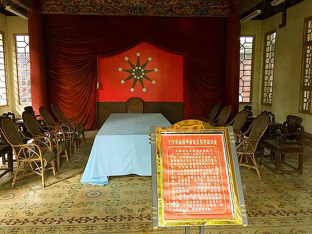 观音阁中有栋建筑的大厅被布置成前敌总指挥部的会议室。大厅中间摆放了一张大会议台,会议台两边排列着十多张藤椅、八仙椅,正前方还设有主席位。就在主席位后面的墙上,挂着一面现今很多人都没见过的旗帜,就是当年鼎鼎大名的“铁血十八星旗”。