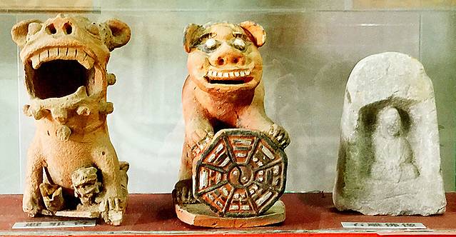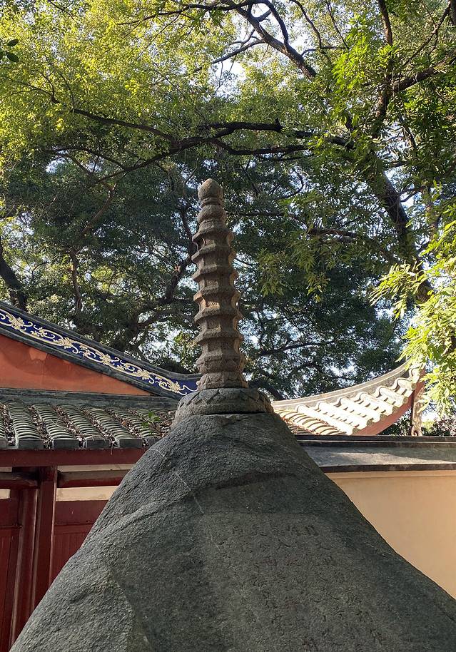 在补山精舍内可以看见这么一方巨石,形似武将头盔,石头顶上有一莲式须陀座石塔