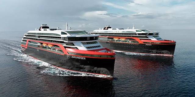 MS Roald Amundsen(阿蒙森号)2019年投入运营,MS FridtjofNansen(南森号)2020年投入运营。在这两艘游轮上,您将感受到下一代探险游轮的全新体验,先进的混合动力技术让这些游轮以可持续的方式运营,使她们能够航行到环境脆弱的荒野,同时将排放降到最低。