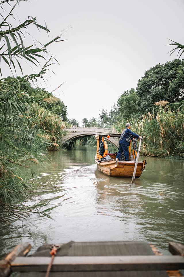 船工一路摇着船,偶尔和我们讲着沙家浜的典故,以及在他心里最值得称道的景色。我们的船一路向芦苇荡深处驶去,穿过一重又一重的桥洞,时而是狭窄的河道,时而是豁然开朗的湖面,白鹭与野鸭不时出现在这如诗般的画卷里,成了最生动的点缀。