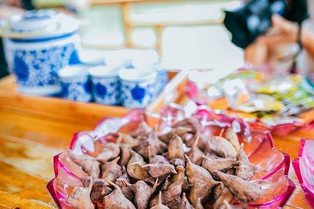 船上早已备好了茶水与红菱角,邓丽君的《采红菱》你一定不陌生,随着天气转凉歌曲里的红菱也悄然上市啦。