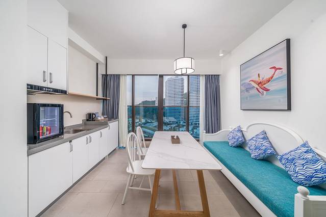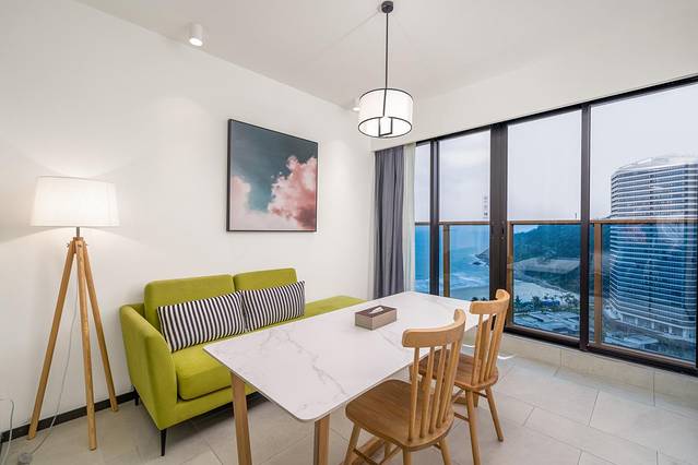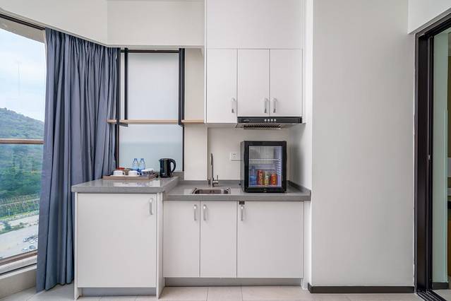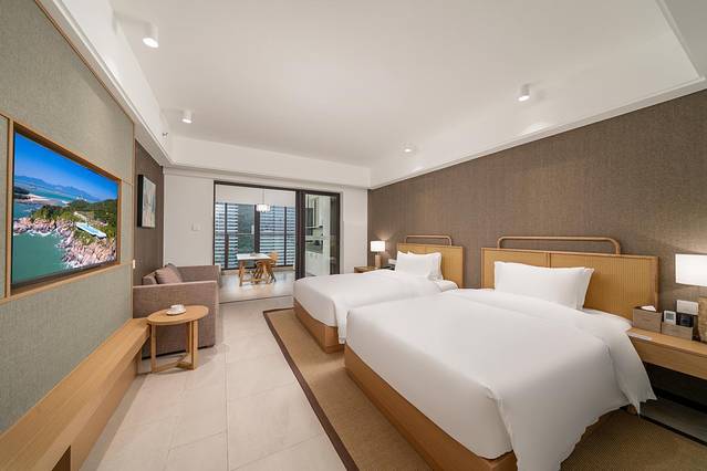 我们入住的是酒店三号楼18层,房间采用了轻奢雅致的设计风格,精致又富有设计感。房间内有一个270°观景阳台,足不出户就可以看到大海,视野很好。这个小阳台也相当于一个小客厅,还配有迷你冰箱,里面的饮料也都是免费的。在宽敞静谧的空间与朋友坐在沙发聊天,相当惬意。