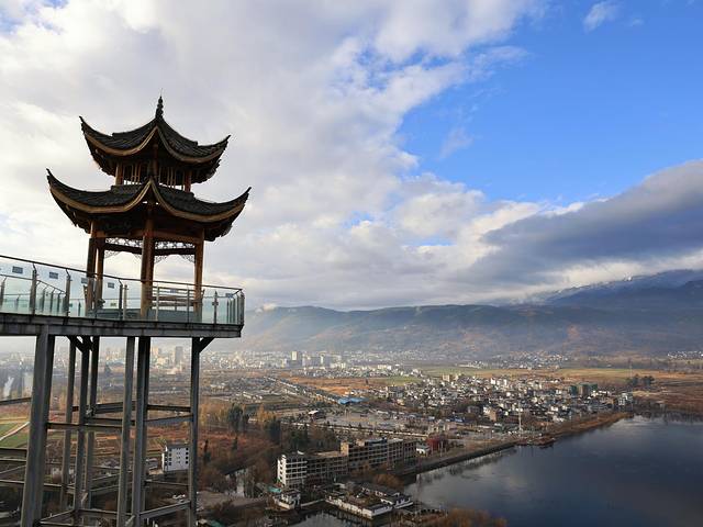 要想一览整个茈碧湖的无限风光,茈碧湖东岸的“观音山”观景平台就是一个最好的地方。这个观景平台,是由玻璃栈桥和三个观景凉亭等构成的,在山脚下一眼便可以看到这个观景平台。