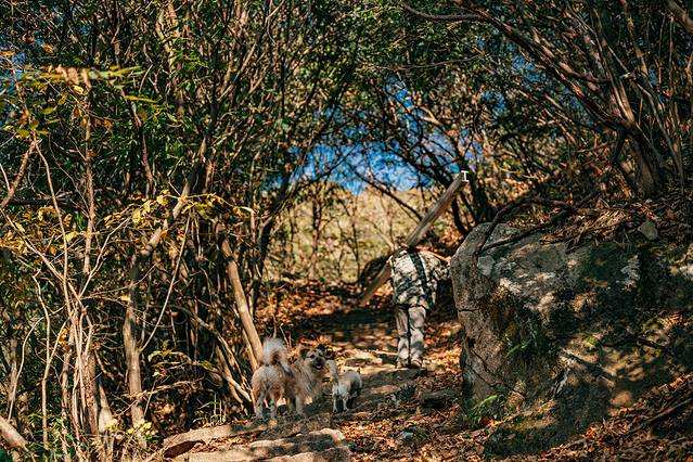 一路上秋意刚到,但因为都是密林而显得杂乱,两只小狗居然给我们当起了领路人,陪着我们一直走到了山顶。